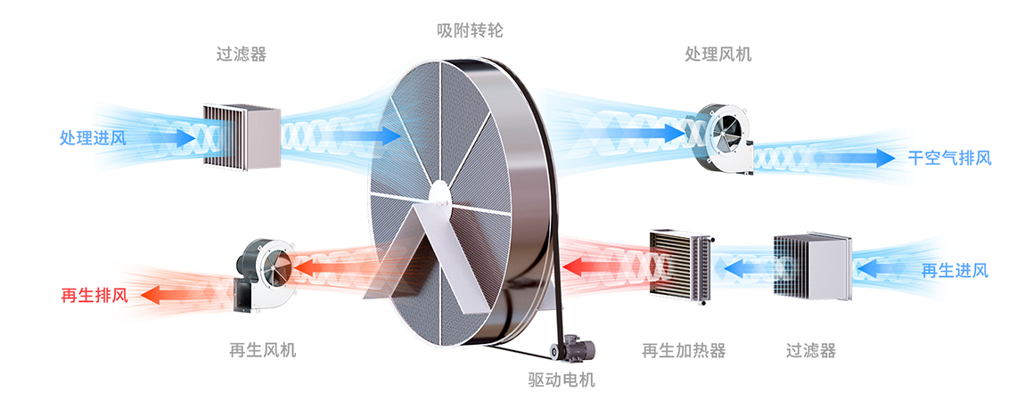 空气经初效过滤网过滤后,进入转轮处理区域,空气中的水分子被除湿转轮的吸湿剂所吸附,达到所要求相对湿度的干空气送入工作场所,最终满足控湿的要求。 转轮在处理空气的扇面区域吸收了的水分子,变成饱和状态,再自动转到再生区域,进行高温再生处理,使转轮恢复除湿能力。